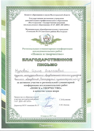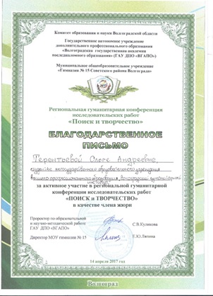 Поздравляем студенток 3 курса факультета психологии, журналистики и дизайна Ирину Жукову и Ольгу Терентьеву с награждением благодарственными письмами Комитета образования и науки Волгоградской области, Волгоградской государственной академии последипломного образования, Гимназии № 15 Советского района г. Волгограда за активное участие Региональной гуманитарной конференции исследовательских работ «Поиск и творчество»